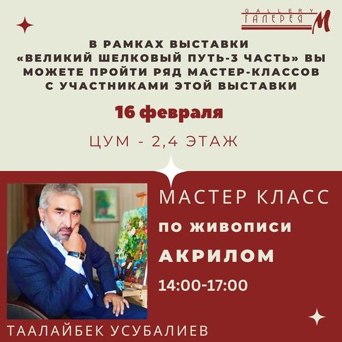 Мастер-класс по живописи акрилом проведет народный художник Кыргызской Республики Таалайбек Усубалиев.