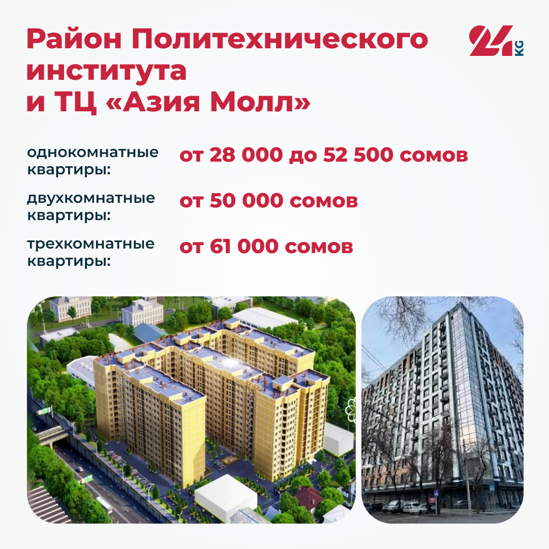 Район Политехнического института и торгового центра «Азия Молл» предлагает однокомнатные квартиры по цене от 28 тысяч до 52 тысяч 500 сомов, но средняя цена около 40 тысяч сомов.