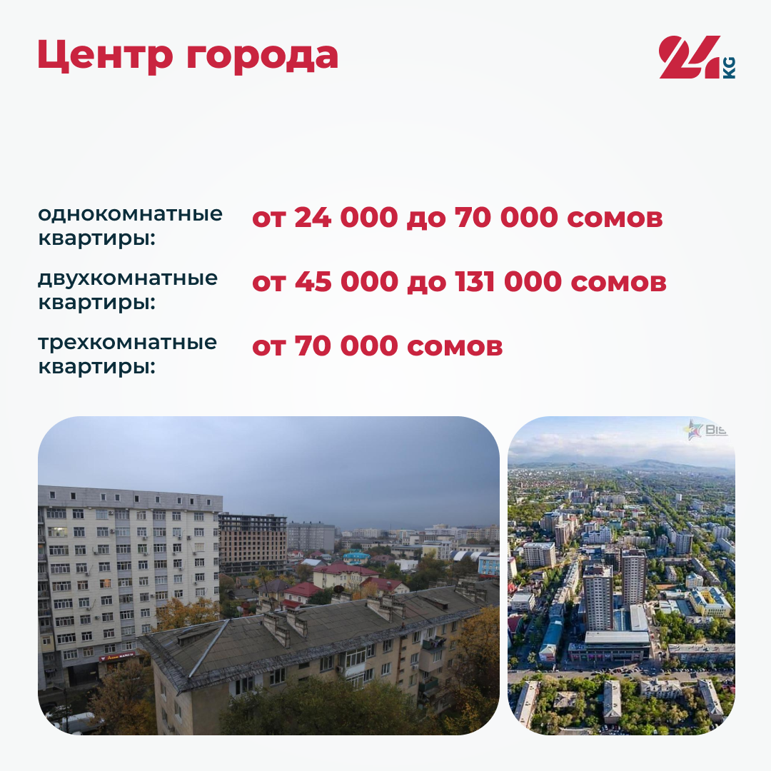 В центре города аренда однокомнатной квартиры обойдется от 24 тысяч до 70 тысяч сомов в месяц. Встречаются предложения и за 32, 38, 50 тысяч и 65 тысяч сомов.