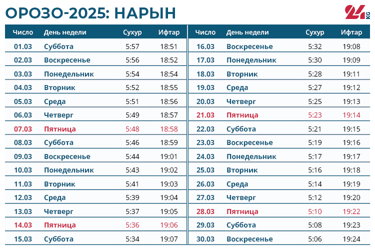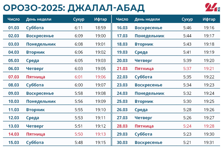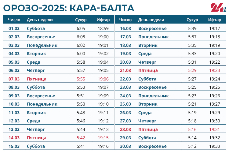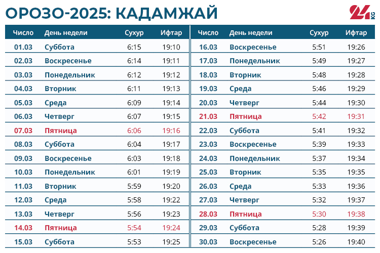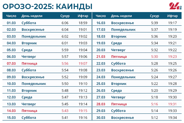 Духовное управление мусульман КР составило календарь Орозо на 2025 год. В нем вы найдете расписание для постящихся — время начала воздержания и разговения в разных городах страны.