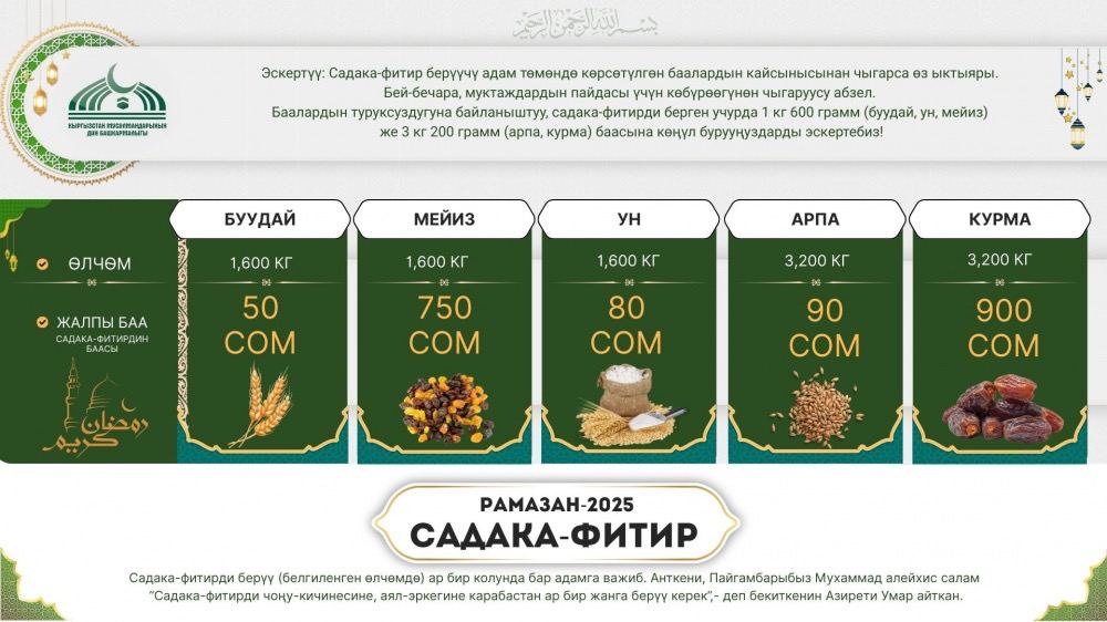 Духовное управление мусульман Кыргызстана утвердило размер фитр-садака на 2025 год. Об этом сообщается на сайте ДУМК.