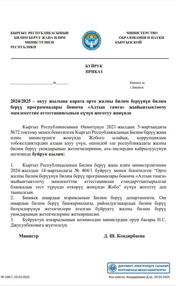 Министр образования и науки КР Догдуркул Кендирбаева подписала приказ об отмене итогового национального тестирования «Алтын тамга» для образовательных программ среднего общего образования в 2024/2025 учебном году.