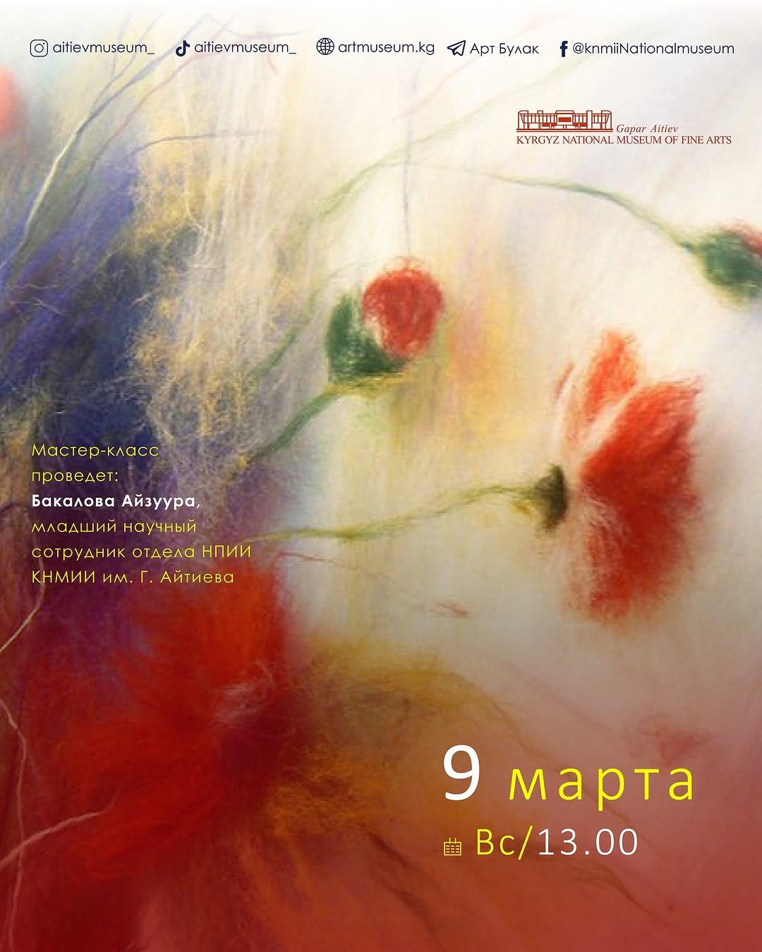 Вы научитесь создавать мини-композиции из войлока. Мастер-класс проведет Айзуура Бакалова. Регистрация по телефону 0500774112.