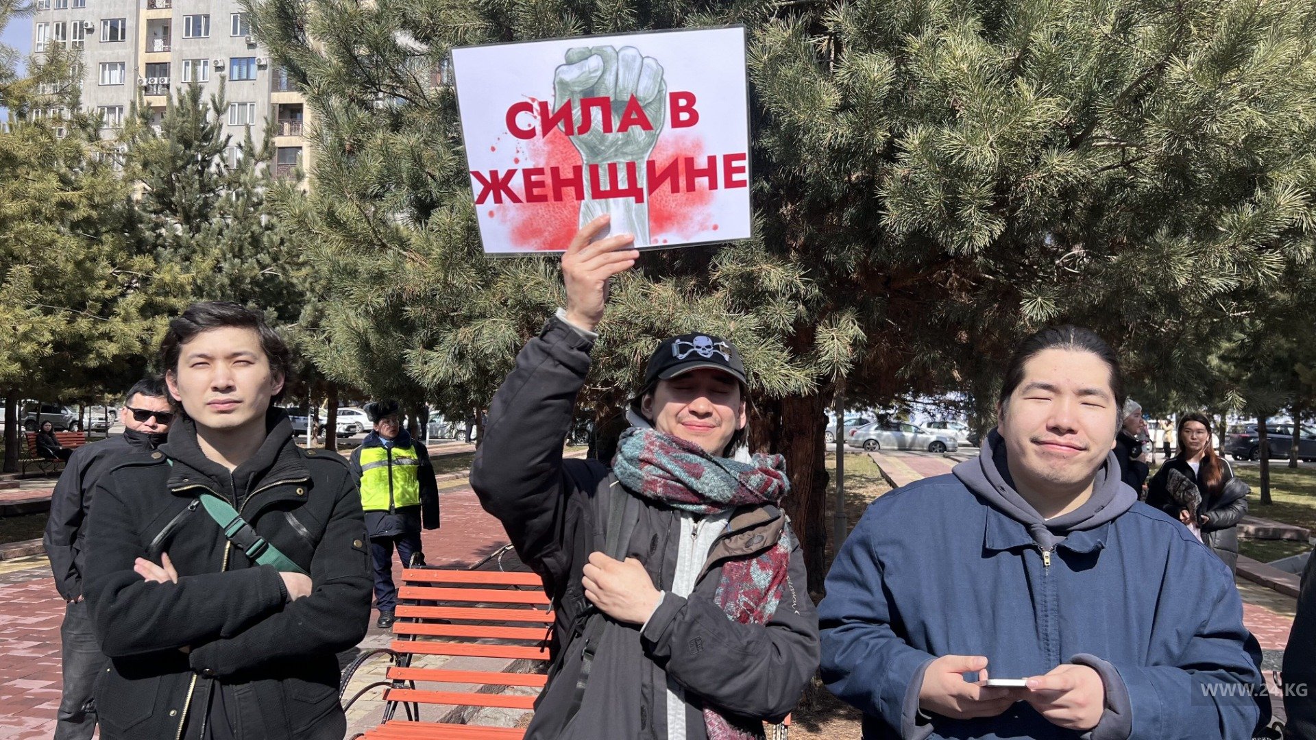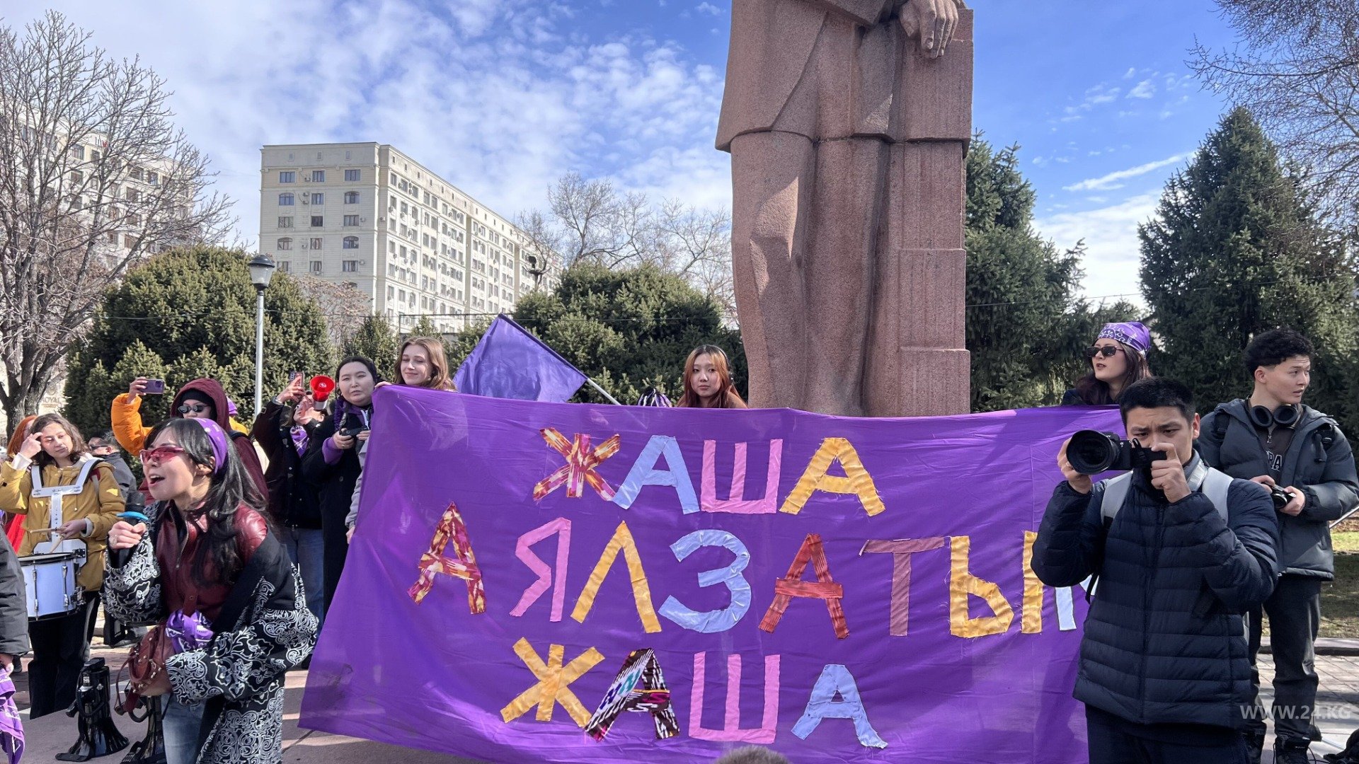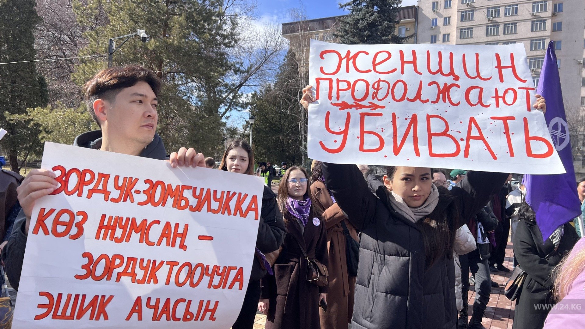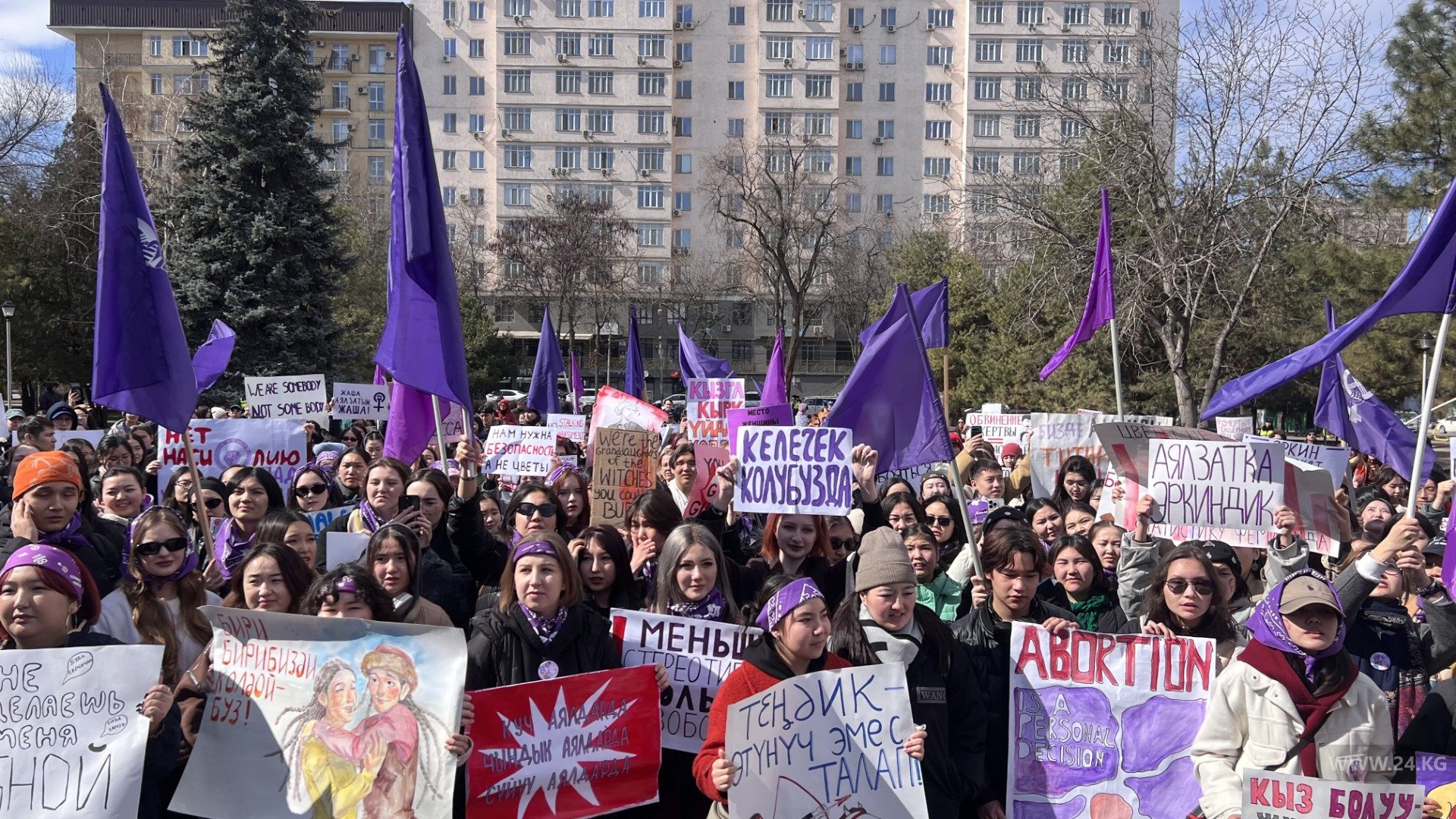 «Женщин продолжают убивать» , «We are somebody not some body» («Мы — личность, а не просто тело»), «Abortion is a personal decision, not a legal debate» («Аборт — это личное решение, а не предмет юридических споров»), «Нет прав, нет прогресса», «Нам нужна безопасность, а не цветы». «Кыз кызды колдойт» («Девушка поддерживает девушку»), «Жаша аялзатым, жаша» («Живи, моя женщина, живи»), «Нет насилию над женщинами», — было написано на плакатах.