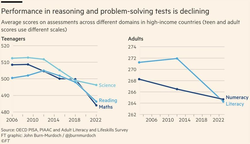 Отмечается, что тенденция наметилась в 2010 году. Именно тогда, судя по тестам, способность рассуждать и находить логический подход к решению задач начала снижатся, и это продолжается.