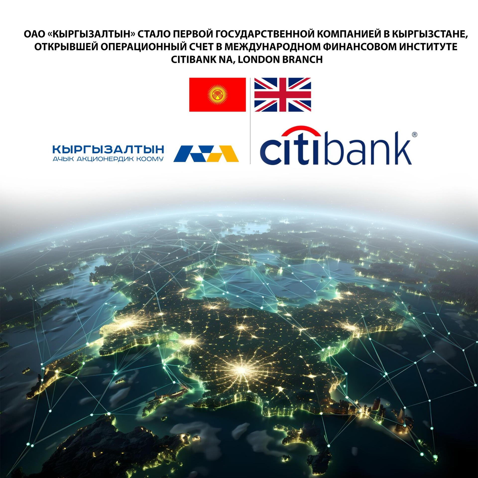 ОАО «Кыргызалтын» стало первой государственной компанией в Кыргызстане, успешно прошедшей все этапы процедуры и открывшей операционный счет в лондонском филиале международной сети банков Citi (Citibank NA, London Branch). Об этом сообщает пресс-служба «Кыргызалтына».