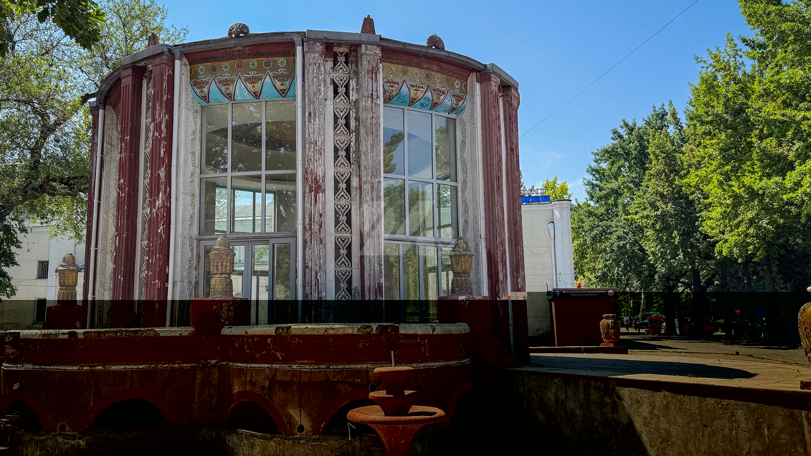 Еще один осколок прежней городской жизни — павильон «Соки-воды» за кинотеатром «Ала-Тоо». Сегодня здесь заколоченные двери, разбитые окна и почти полностью разрушенные фигурки лягушек, украшавших фонтан.