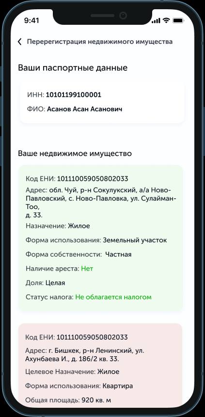 После получения уведомления (на e-mail и в Telegram-бот, если подключен) зайти в приложение «Тундук», раздел «Моя недвижимость» → «Перерегистрация недвижимости».
