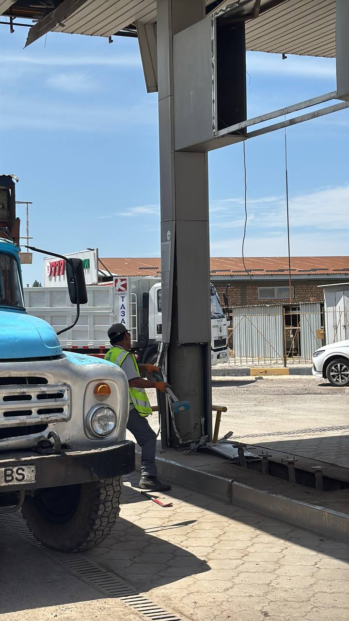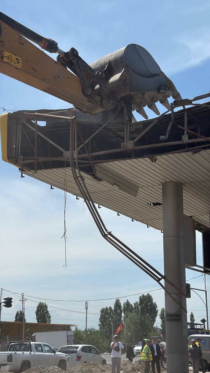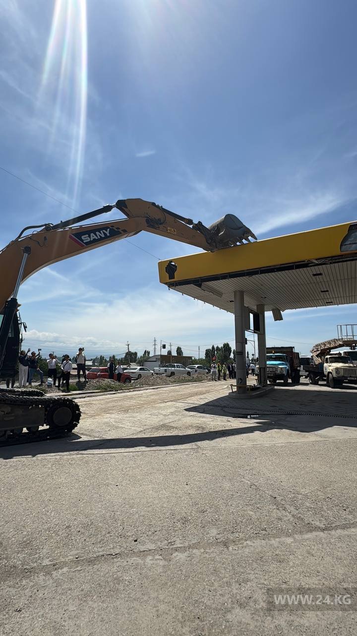 На первой точке в присутствии градоначальника начали сносить АЗС и трехэтажное здание рядом с ней. По словам Айбека Джунушалиева, это необходимо для расширения объездной дороги, АЗС и строение рядом с ним мешали. По его словам, вдоль дороги уже снесли около 10 автозаправочных станций и прочих строений.