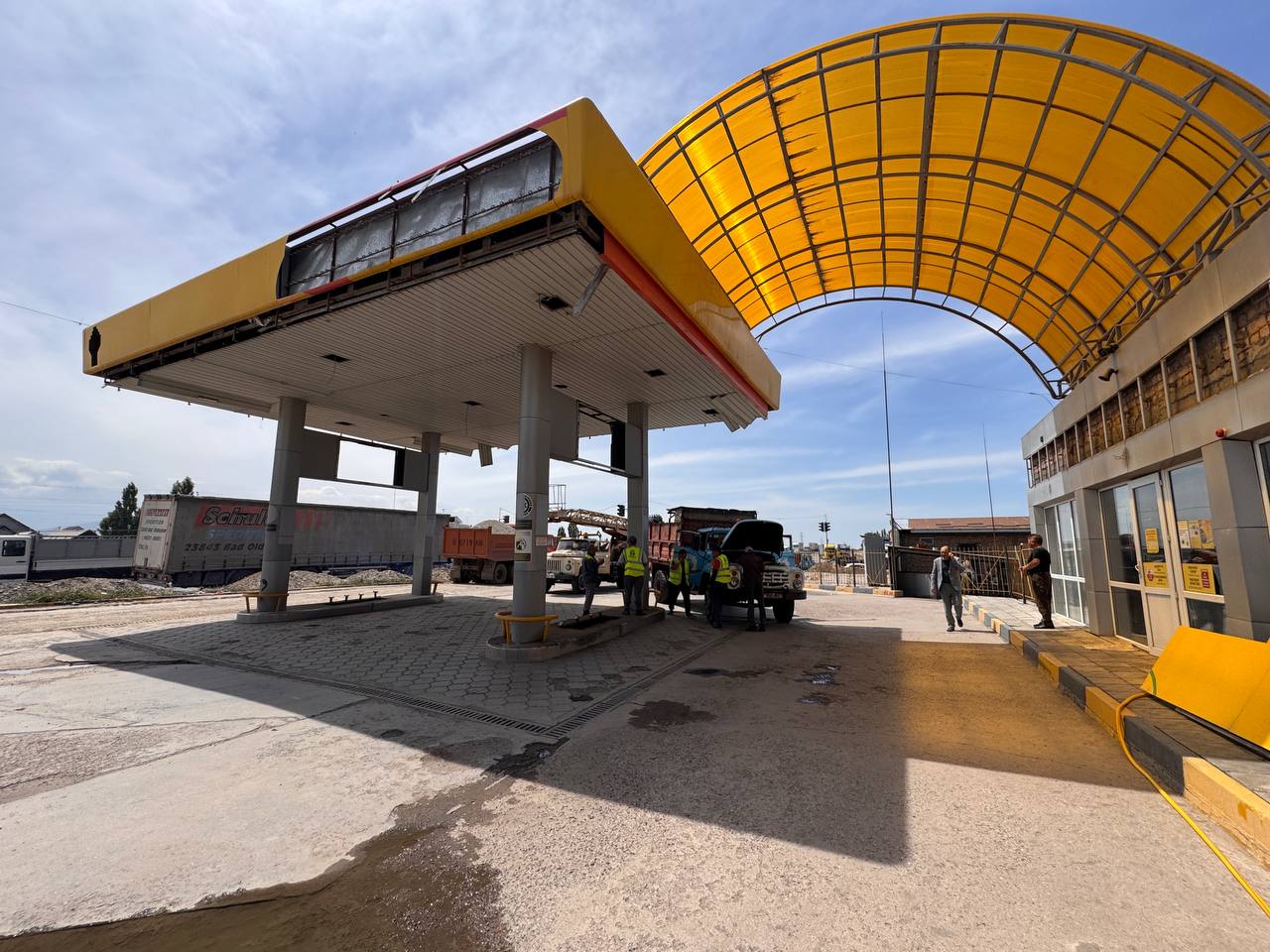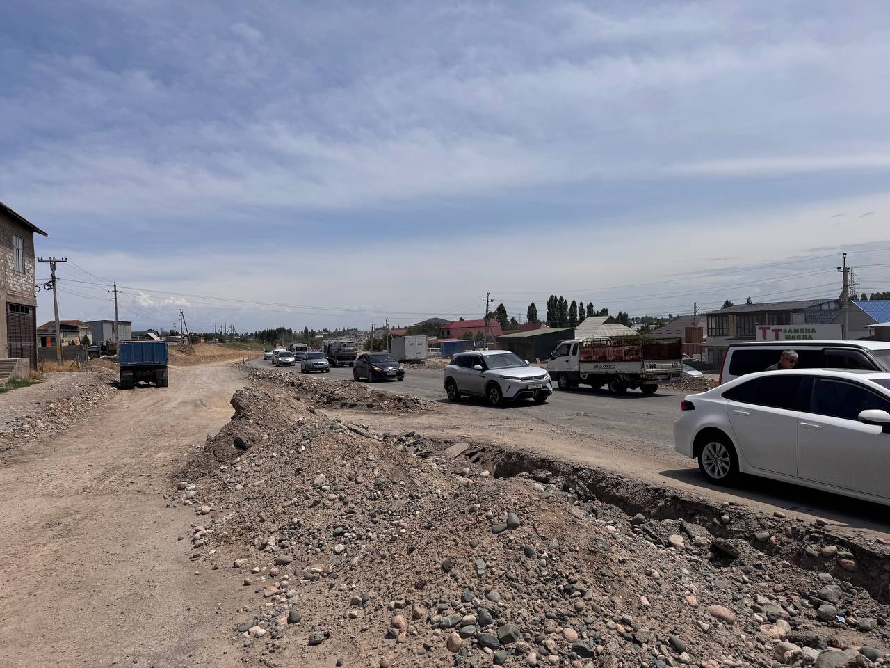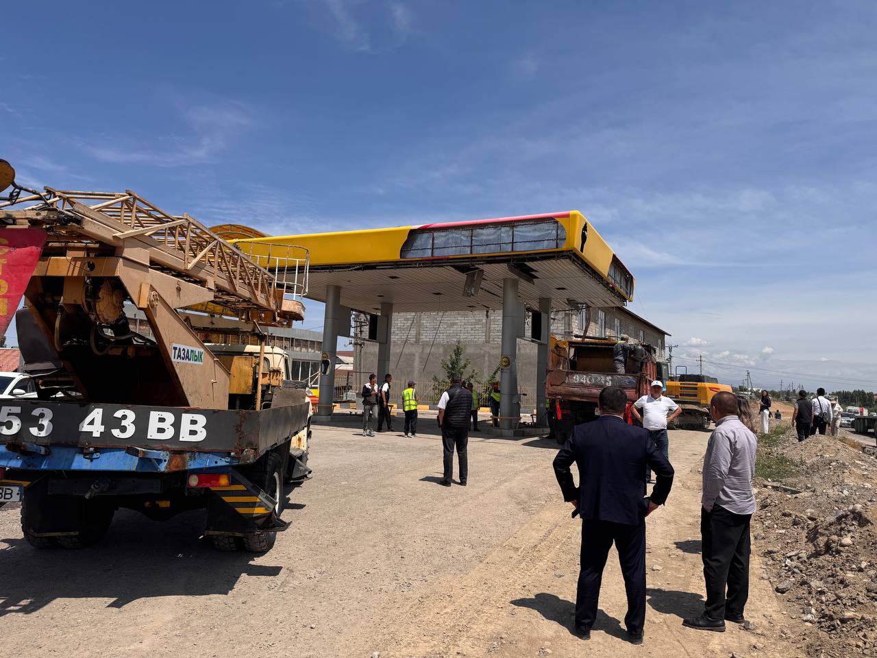 На первой точке в присутствии градоначальника начали сносить АЗС и трехэтажное здание рядом с ней. По словам Айбека Джунушалиева, это необходимо для расширения объездной дороги, АЗС и строение рядом с ним мешали. По его словам, вдоль дороги уже снесли около 10 автозаправочных станций и прочих строений.