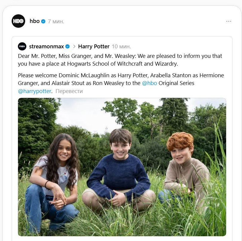«Дорогие мистер Поттер, мисс Грейнджер и мистер Уизли! Мы рады сообщить вам, что у вас есть место в Школе чародейства и волшебства Хогвартс. Поприветствуйте Доминика Маклафлина в роли Гарри Поттера, Арабеллу Стэнтон в роли Гермионы Грейнджер и Аластера Стаута в роли Рона Уизли в оригинальном сериале HBO «Гарри Поттер», — говорится в посте, который разместили в соцсети Threads.