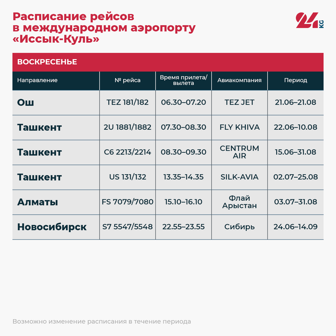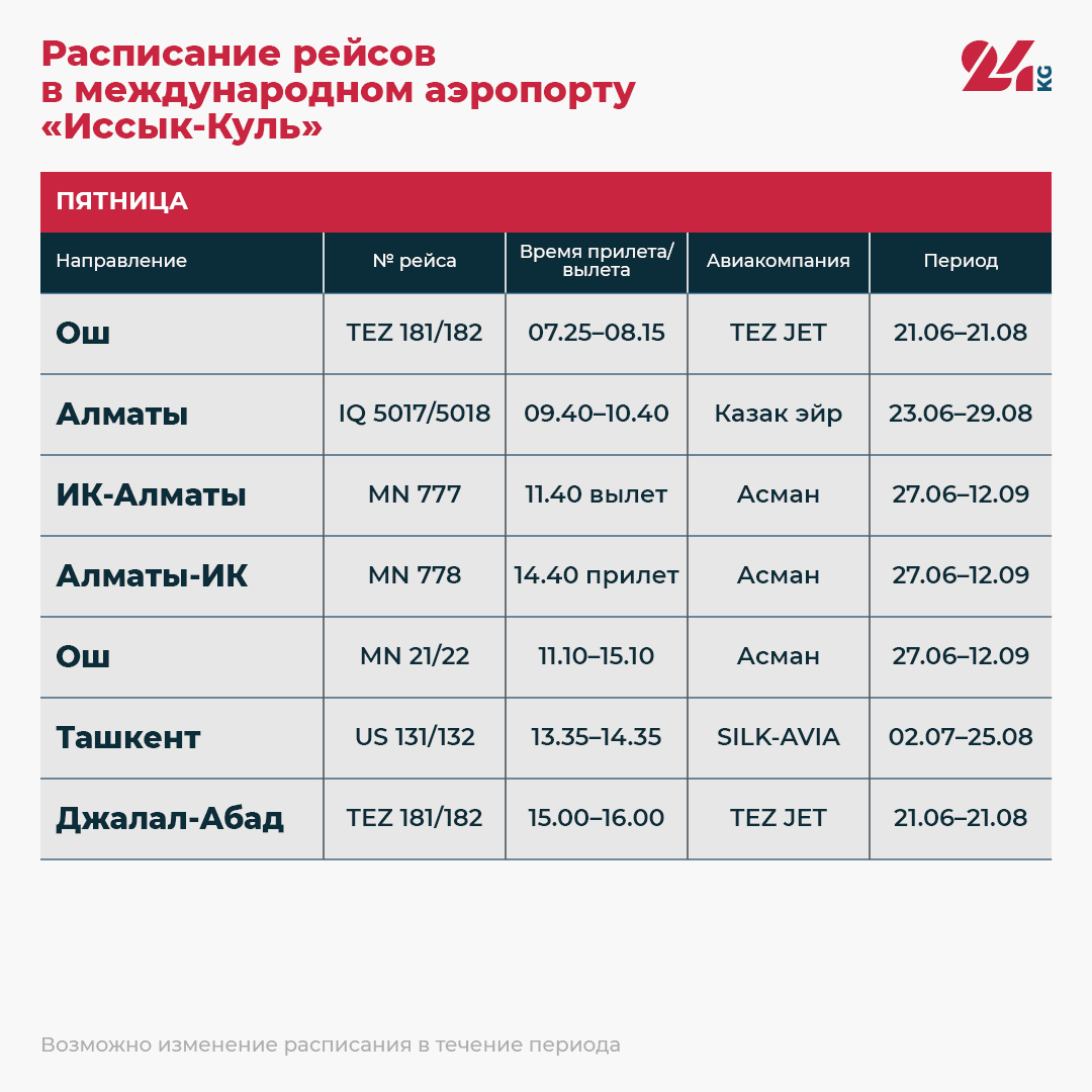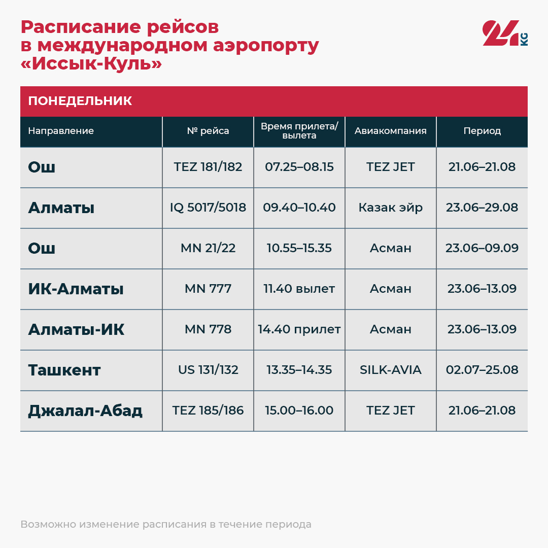 Наступило лето, а значит, открыт купальный сезон на Иссык-Куле. ОАО «Аэропорты Кыргызстана» поделилось расписанием рейсов в международном аэропорту «Иссык-Куль».