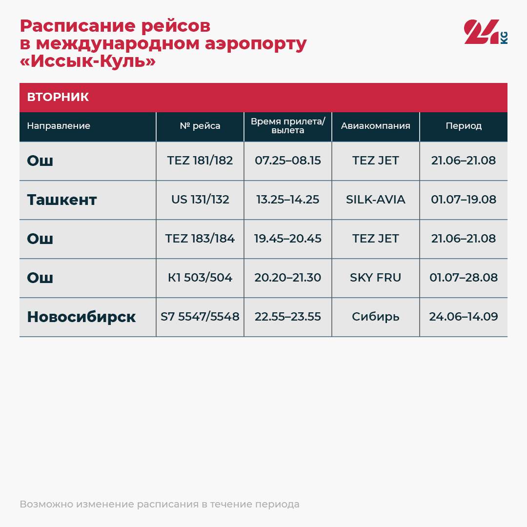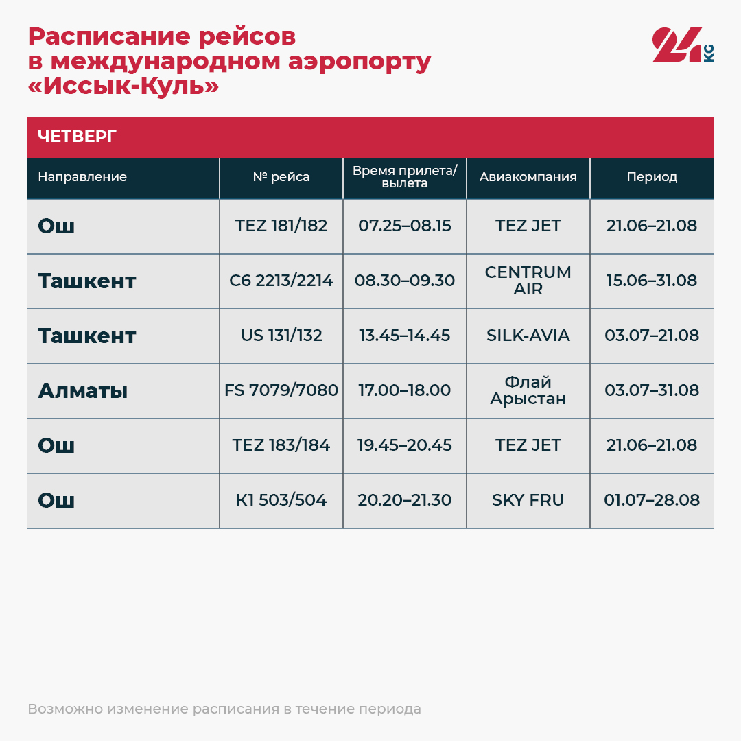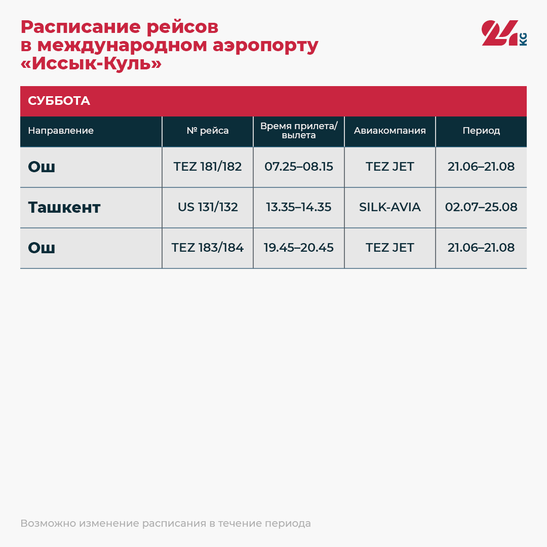 Наступило лето, а значит, открыт купальный сезон на Иссык-Куле. ОАО «Аэропорты Кыргызстана» поделилось расписанием рейсов в международном аэропорту «Иссык-Куль».