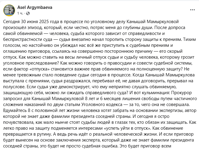 «Тихим голосом, но настойчиво он убеждал нас приступить к судебным прениям и оглашению приговора, ссылаясь на постороннюю причину — его скорый отпуск. Как можно ставить на одну чашу весов личные планы судьи и судьбу человека, которому грозит до 8,5 года лишения свободы?» — написала Асель Аргымбаева.
