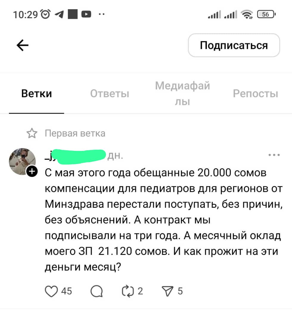 Напомним, с 1 июля прошлого года по указу президента компенсационные выплаты в размере 20 тысяч сомов предусмотрены востребованным врачам — педиатрам, неонатологам, общим хирургам и анестезиологам-реаниматологам, направляемым на работу в отдаленные районы, малые города и сельскую местность. Бишкека и Оша это не касается, поскольку они кадрами обеспечены.