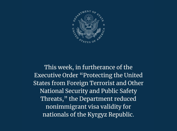 Кыргызстан попал в список стран, которым Государственный департамент США сократил срок действия неиммиграционных виз. Об этом сообщает пресс-служба посольства Америки в КР.