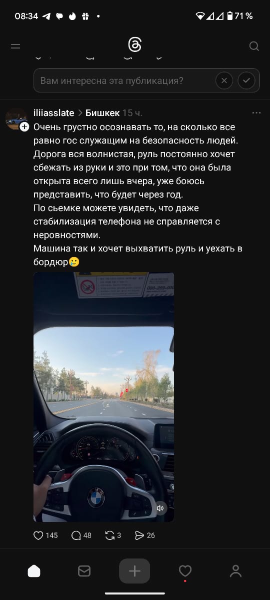 Первое впечатление за рулем: «Красиво, но плывет». Асфальт визуально ровный, но машина на нем ведет себя как на морских волнах. «Тянет в сторону, будто на пароме», — делятся в соцсетях водители. Некоторые предполагают, что новая дорога «подходит для серфинга, но не для левого поворота».