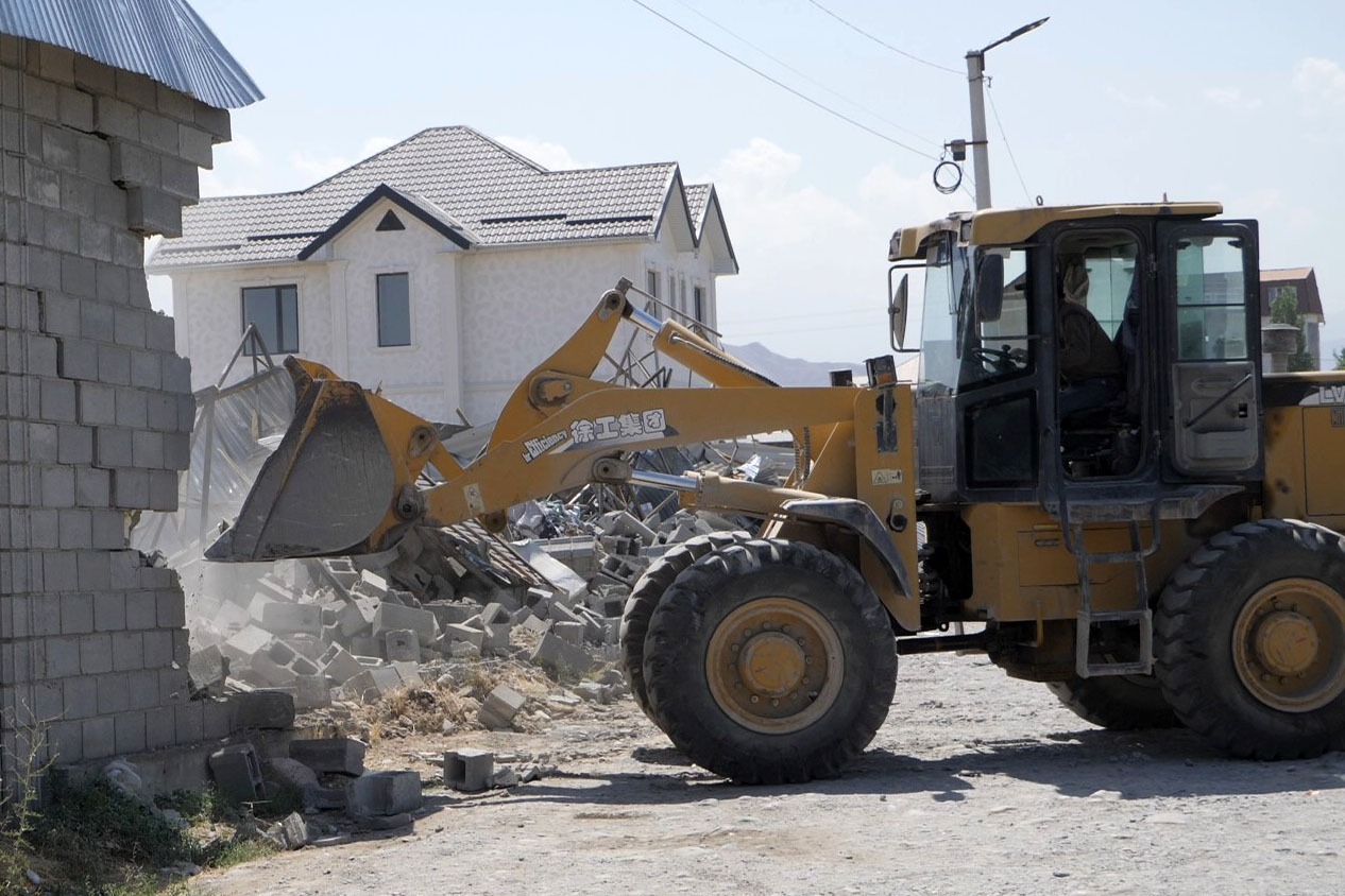 В жилмассиве «Кок-Жар» неспокойно — второй день подряд здесь сносят строения. Контур № 172 — окраина села, которая в прошлом году официально стала частью Бишкека. Сегодня сюда съехались сотни сотрудников МВД, дорога перекрыта, техника работает, людей все больше.