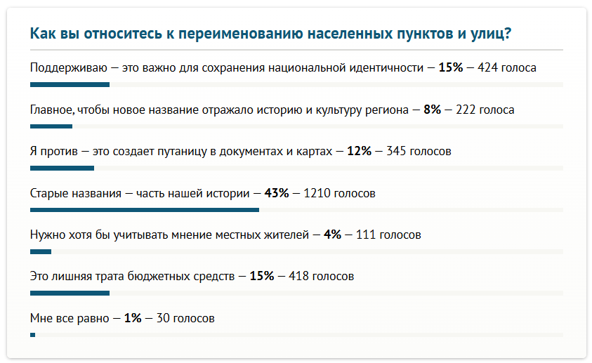 Согласно результатам, 43 процента респондентов (или 1,2 тысячи голосов) считают старые названия частью нашей истории. Еще 12 процентов (или 345 голосов) выступают против идеи, поскольку это создает путаницу в документах и картах.