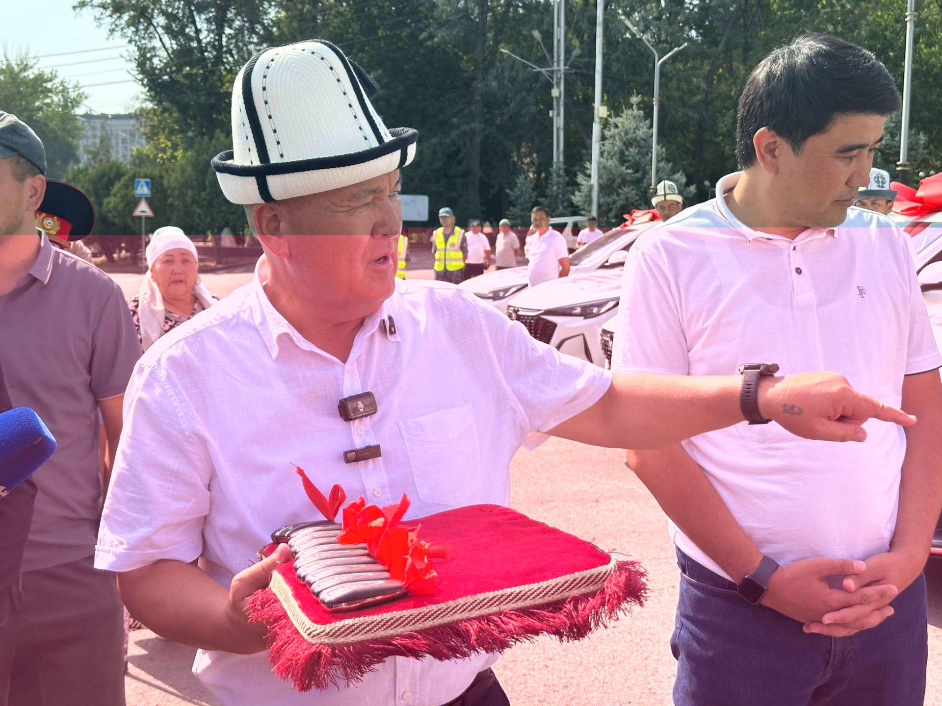 Асылбек Муратбеков заявил, что поддерживает работу, проводимую в городе Оше, и подарил электроавтомобили с надписью «Подарок от жителей Джалал-Абада жителям Оша», передав ключи мэру Женишбеку Токторбаеву.