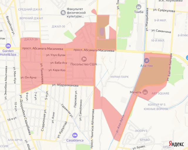 • Масалиева — проспектом Чингиза Айтматова — Абдрахманова — Садырбаева;
