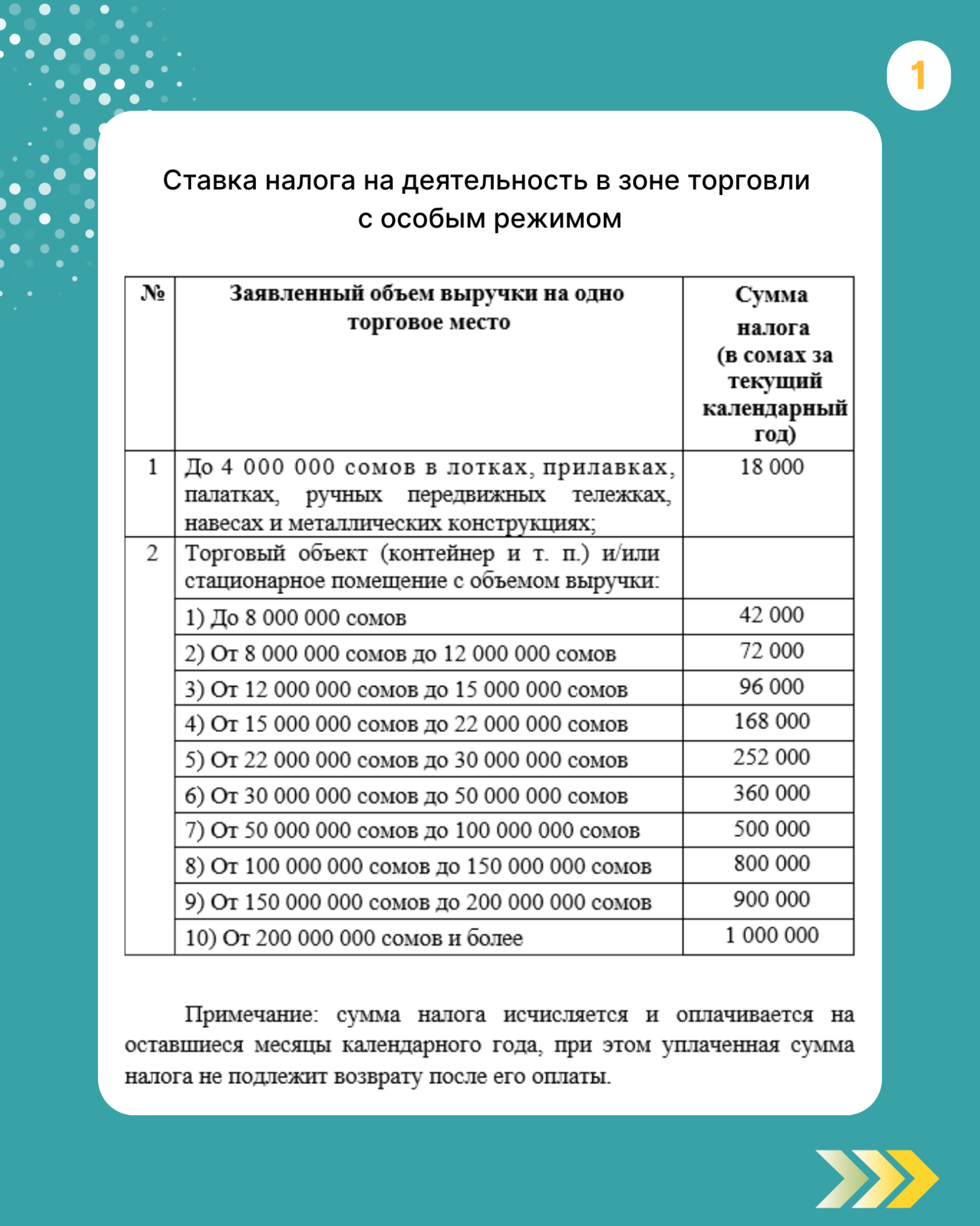 В Кыргызстане утвердили новые нормы налогового законодательства для торговой деятельности. Так, установили базовые суммы патентов на торговлю и налоговые ставки для особого режима: