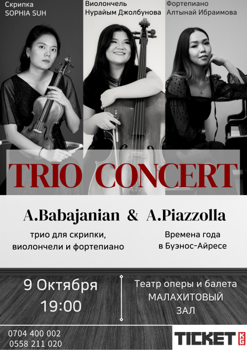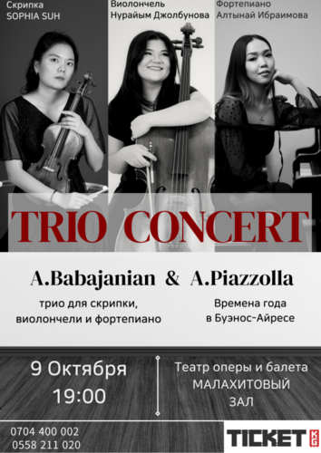 Прозвучат произведения известных композиторов в исполнении лауреаток международных конкурсов Софьи Су (скрипка), Алтынай Ибраимовой (фортепиано) и Нурайым Джолбунова (виолончель).