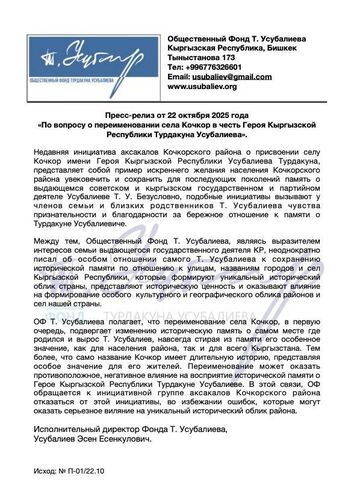 Фонд также отметил, что в Кочкоре и так сохраняется память о Турдакyне Усубалиеве — здесь установлены памятные знаки, проводятся культурные и просветительские мероприятия, посвященные его деятельности.