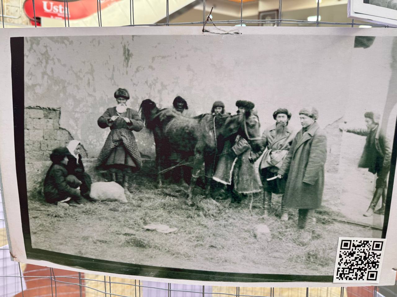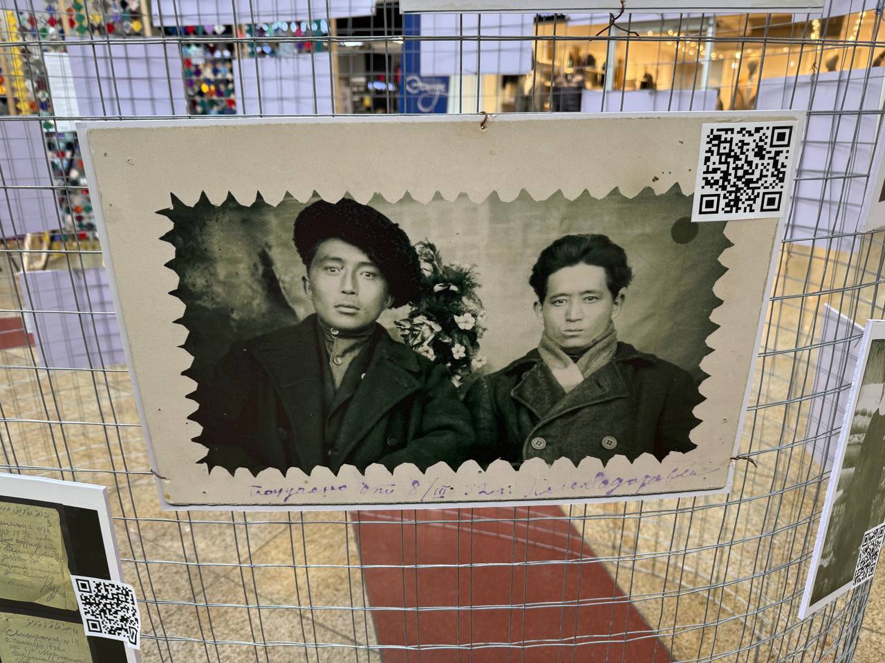 Сразу за полотном находится стенд с фотографиями, на которых запечатлены наши предки. Каждый может отсканировать QR-код с фото и перейти на специальную страницу проекта «Эсимде», позволяющую найти своего близкого родственника по имени или фамилии. Стоит отметить, что организаторы проделали большую работу, чтобы создать такую большую базу данных.