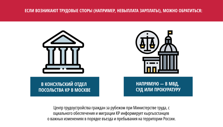 Если возник вопрос о невыплате заработной платы со стороны работодателя, граждане Кыргызстана могут обратиться в консульский отдел посольства КР в РФ с соответствующим заявлением (с приложением копий трудового договора, паспорта и иных документов, подтверждающих факт осуществления трудовой деятельности) об оказании содействия либо самостоятельно обратиться в судебные и правоохранительные органы Российской Федерации.