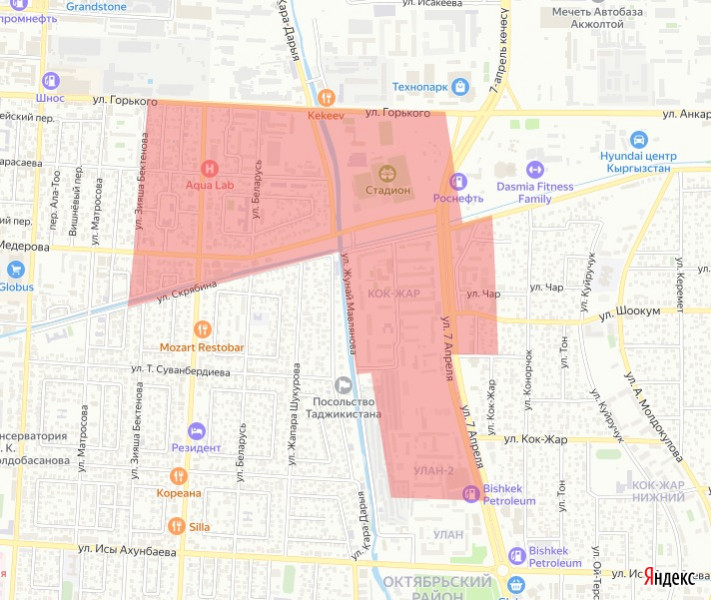 - 7 Апреля — микрорайон «Улан2» — река Аламедин— улицы Скрябина, Юнусалиева — Горького — 7 Апреля.