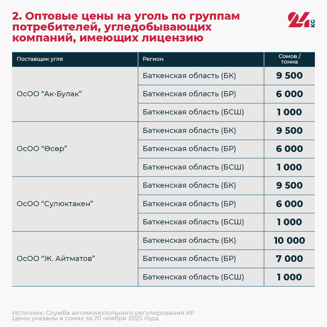 Согласно решению, цены на уголь для угледобывающих компаний, поставляющих топливо на МП «Бишкек ТЭЦ» и другие теплоснабжающие предприятия, установлены с учетом НДС и НСП:
