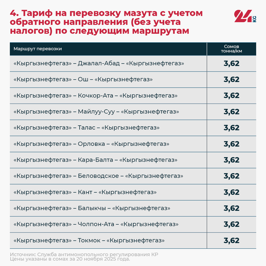 Помимо этого, установили стоимость перегрузки угля на железнодорожный транспорт на погрузочно-разгрузочной площадке Балыкчи. Тариф составляет 262,60 сома за тонну без учета НДС и НСП.