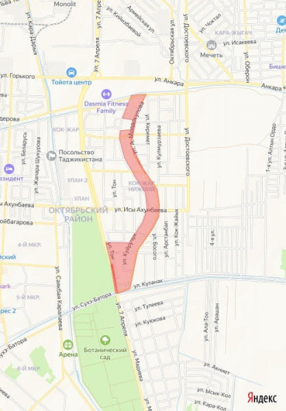 Район отключения ограничен:- улицей Куланак по Молдокулова и улицей Куйручук до Кулмурзаева;