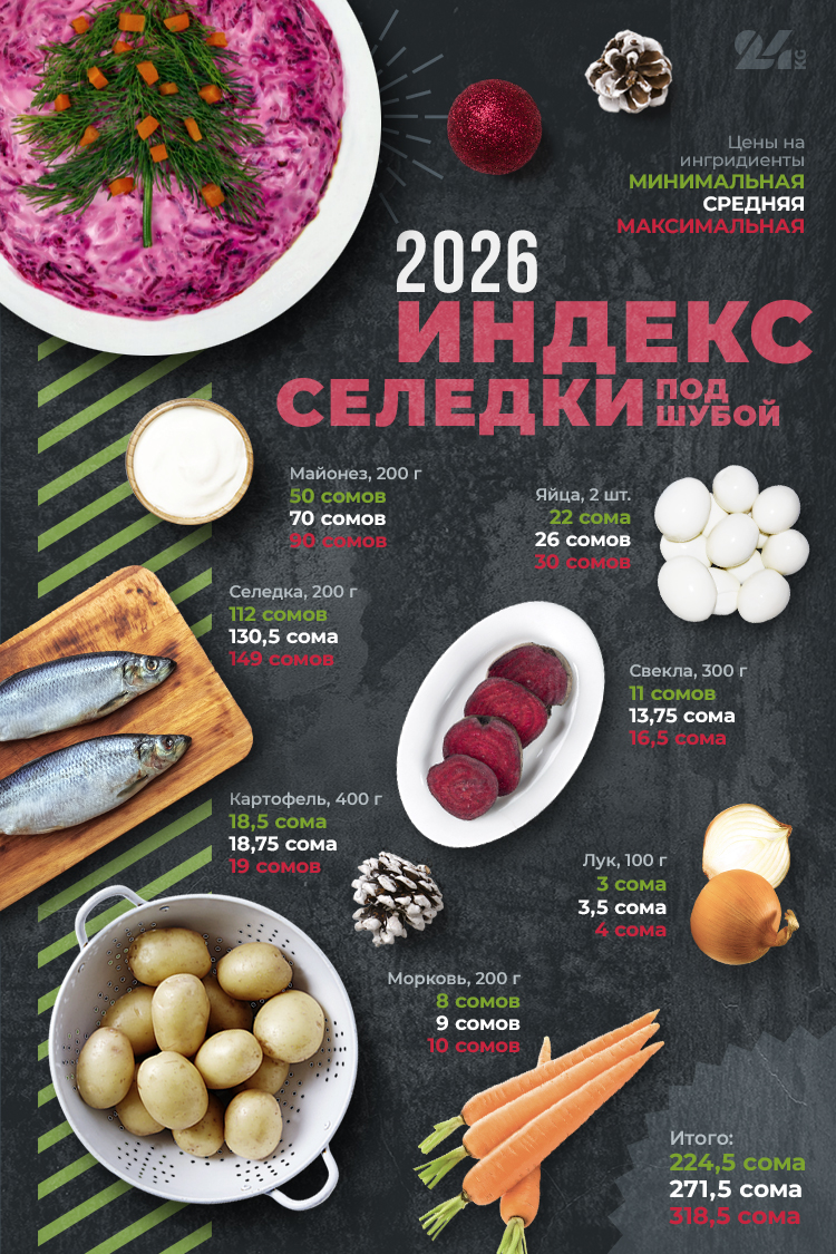 В итоге минимальная стоимость этой закуски составила 224,5 сома, что на 8 сомов ниже, чем год назад. Максимальная цена по сравнению с 2024-м выросла на 40 сомов. Тем не менее рыба под шубой по-прежнему остается доступным новогодним угощением. Его стоимость почти в два раза ниже салатницы оливье.