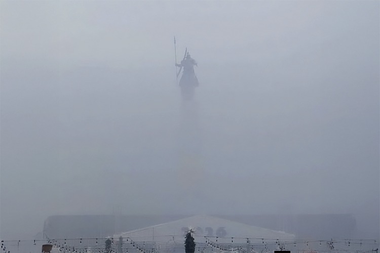 Горожане отмечают, что фигура Манаса, проступающая сквозь плотную серую завесу, выглядит почти призрачно.