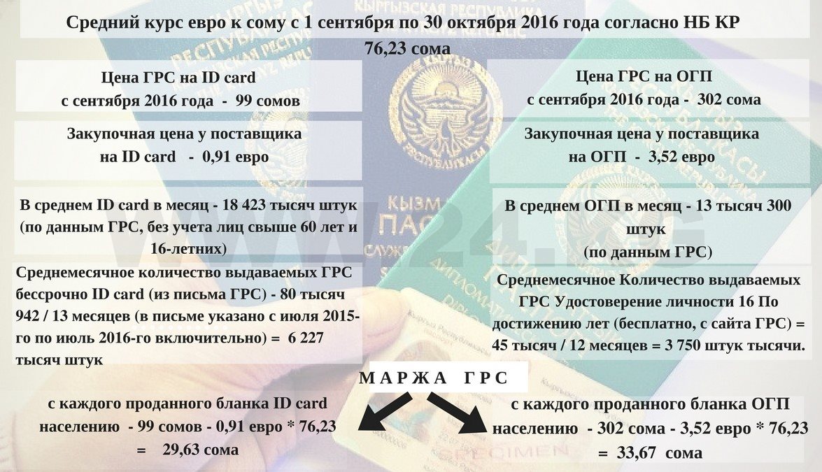 - IDcard - 76,49 сома (0,91 евро*84,05) и загранпаспорта (ОГП)- 295,85 сома (3,52 евро*84,05).