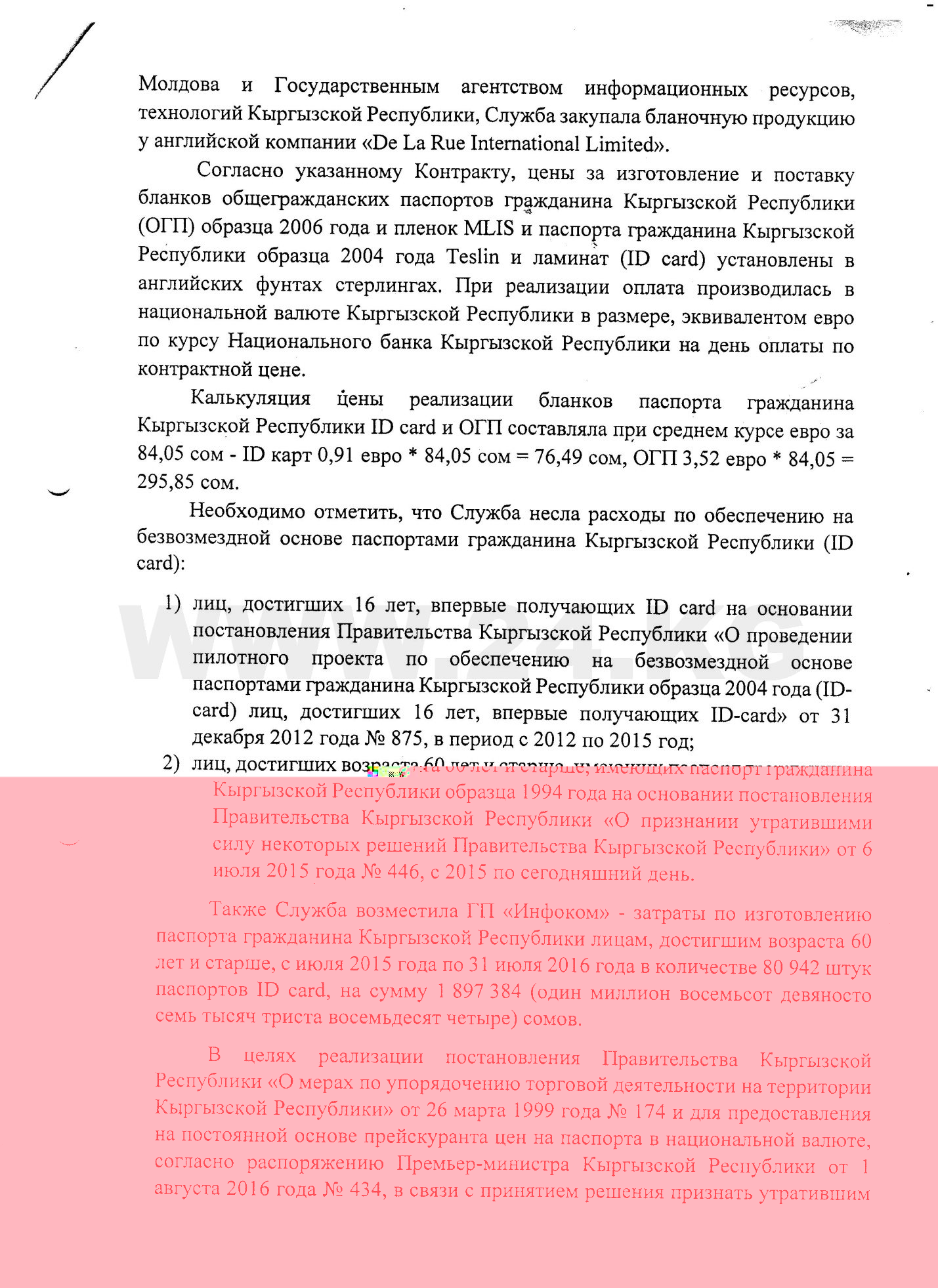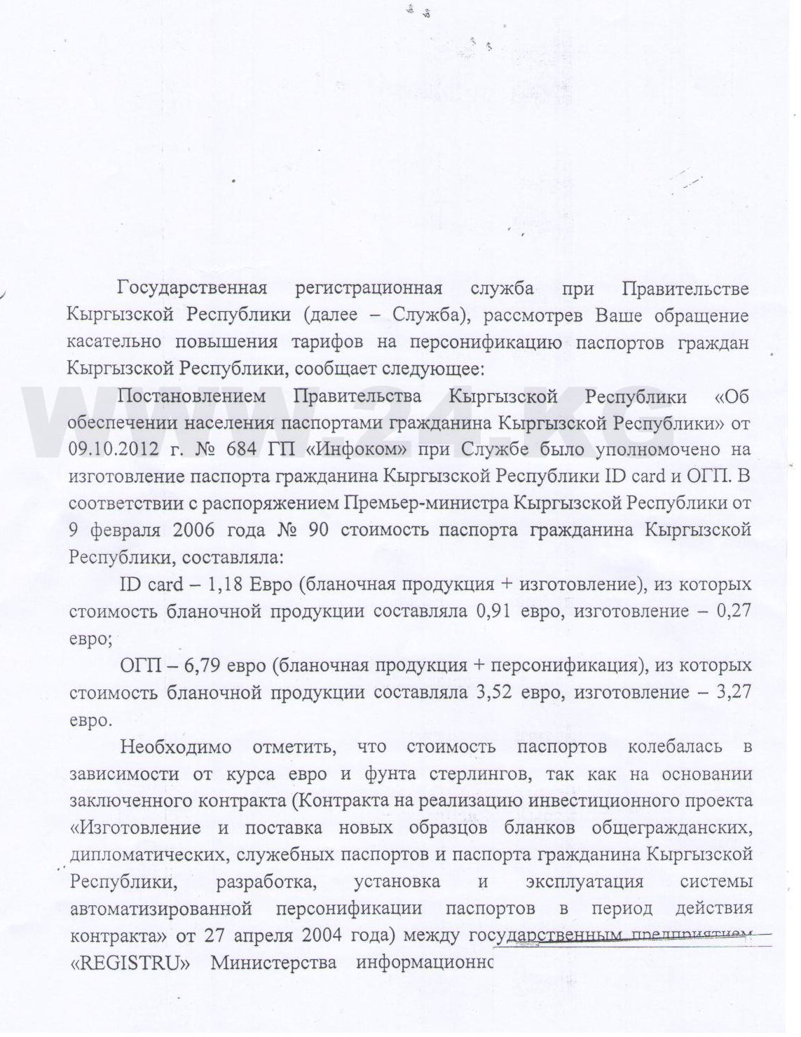 В письме Дастан Догоев отмечает, что «стоимость паспортов колебалась в зависимости от курса евро и фунта стерлингов», так как по контракту цены за изготовление и поставку бланков общегражданских паспортов + пленки MLIS и ID card + Teslin установлены в английской валюте. «При реализации проекта оплата производилась в национальной валюте КР в размере, эквивалентном евро по курсу НБ КР на день оплаты по контрактной цене», - пишет он.