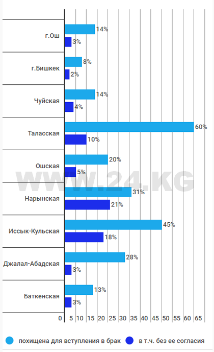 «Браки, заключенные через похищение женщин без их согласия, отмечаются в стране (в большей или меньшей степени) повсеместно: от 2 процентов в Бишкеке до 21 процента в Нарынской области. Чаще похищают девушек, имеющих лишь начальное образование или без образования, а также из беднейших домохозяйств. Такие случаи в селах происходят почти в два раза чаще, чем в городах», — говорится в документе.