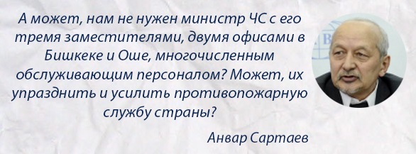 Он отмечает, что руководство МЧС КР прорабатывает вопрос о сокращении Агентства государственной противопожарной службы (АГПС) и его областных управлений. Делается это с согласия главы АГПС Нуржана Осмоналиева под видом оптимизации.
