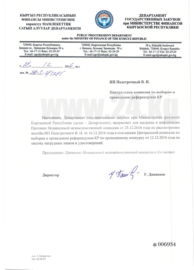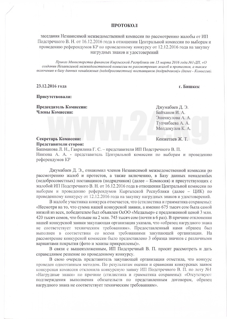 Сегодня межведомственная комиссия по рассмотрению жалоб на действия или бездействие закупающих организаций в соответствии со статьей 49 закона КР «О госзакупках» рекомендует отменить тендер на ЛОТ №1 «Нагрудные знаки». Об этом ИА «24.kg» сообщили адвокаты Виталия Подстречного.