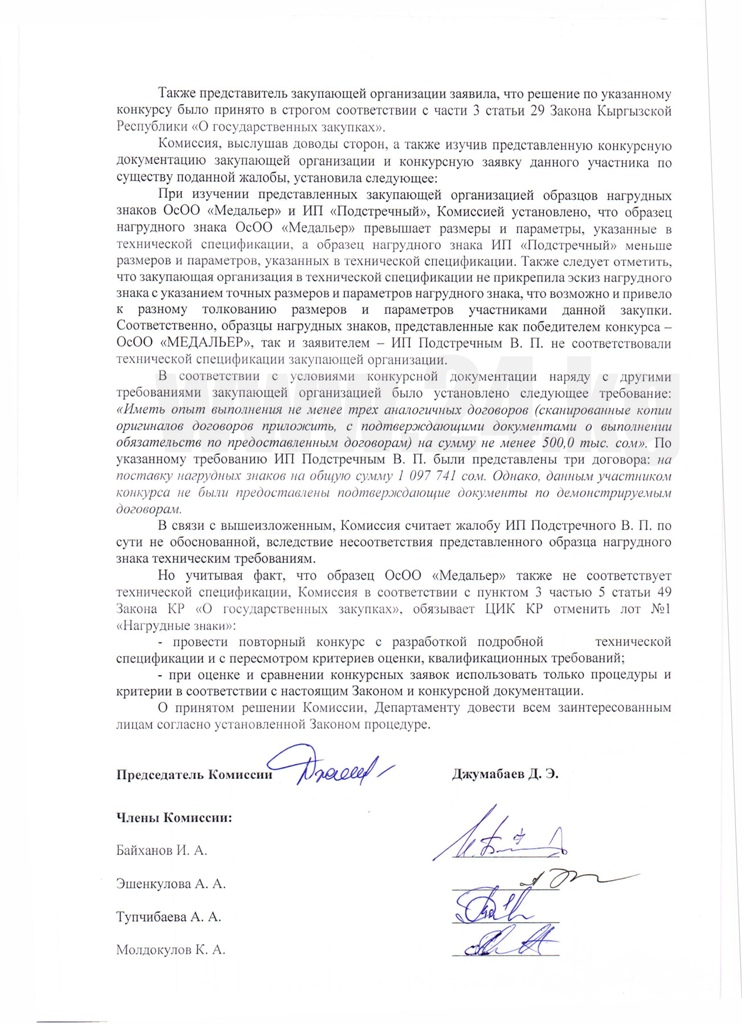 Однако на заседании межведомственной комиссии по рассмотрению жалоб на действия или бездействие закупающих организаций, где рассматривался вопрос по тендеру на значки для депутатов местных кенешей, выяснилось, что и продукция ОсОО «Медальер», не соответствует техническим требованиям.