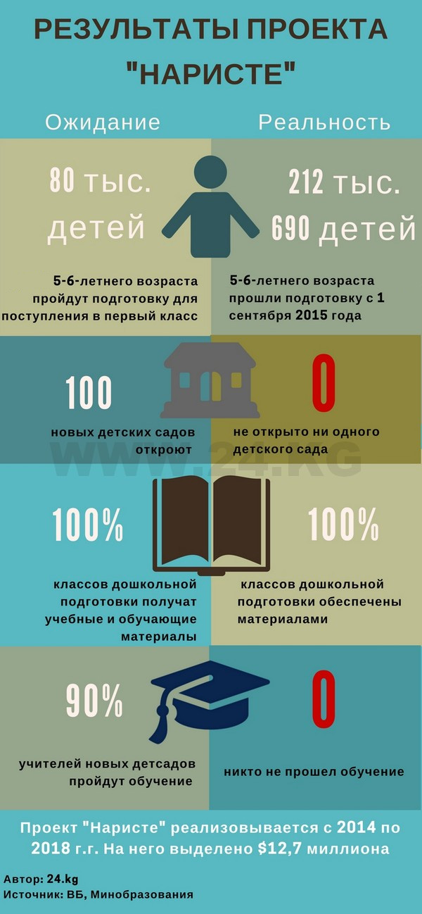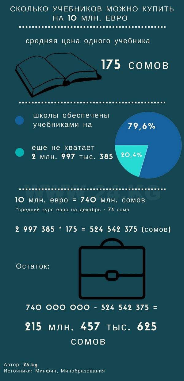 Впрочем, на учебники государство более или менее тратится. По словам депутата Жогорку Кенеша Натальи Никитенко, средства на тиражирование учебной литературы выделяются ежегодно. «В том числе через кредиты и гранты. С 2010 по 2015 год из бюджета выделили 450 миллионов 475 тысяч сомов, но процент обеспеченности учебниками за 4 года вырос лишь с 70 до 79,6 процента, а не на 20 процентов», — рассказала она.