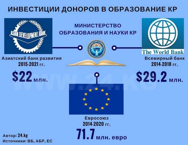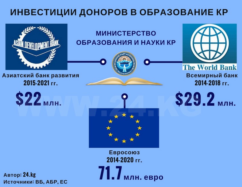 ИА «24.kg» повторно запросило у Минфина информацию о выделенных грантах и кредитах для образования. Однако в списке доноров ЕС вообще не оказалось, хотя соглашение подписали в 2016 году. Более того, финансисты заявили, что за прошедший год не поступило ни одного транша для Министерства образования и науки.