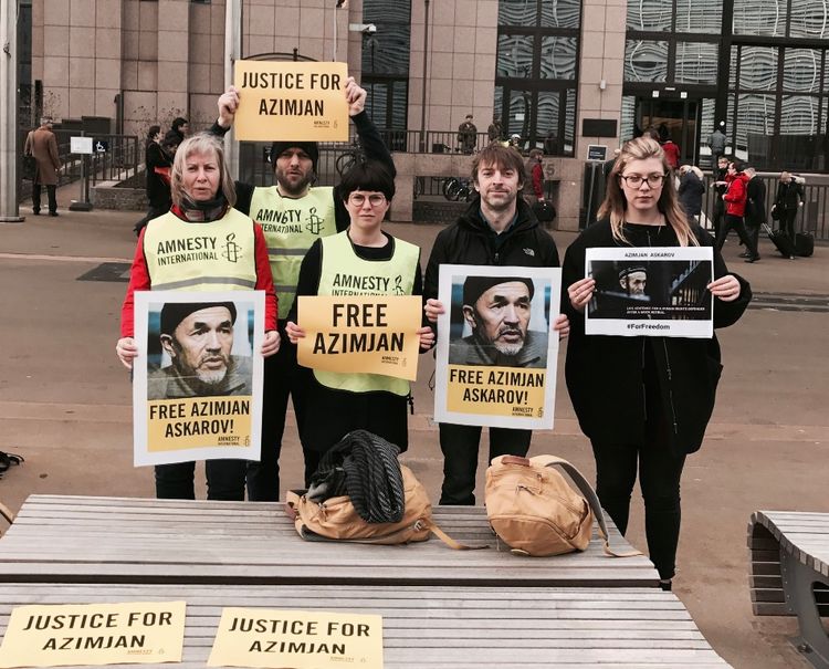 Активисты Amnesty International встретили президента Кыргызстана в Брюсселе пикетом в поддержку Азимжана Аскарова.