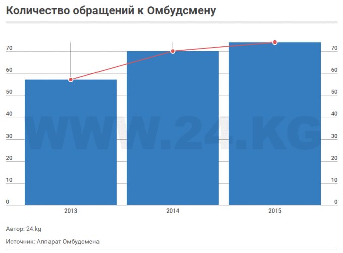 В аппарате омбудсмена ИА «24.kg» рассказали, что за 2016 год поступило 47 обращений, однако ни один факт жестокого обращения не подтвердился. Информация из регионов еще не обработана. Статистика за последние 3 года говорит о том, что количество обращений постоянно растет. За это время имеется только один факт в Джалал-Абадской области, когда двоих милиционеров осудили за применение пыток.