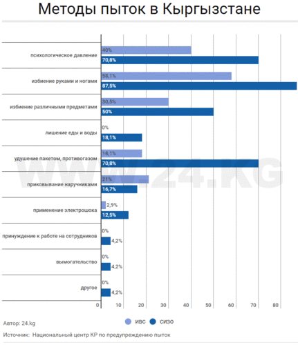 В ежегодном докладе Национального центра по предупреждению пыток Кыргызстана за 2015 год говорится, что почти 28 процентов от общего числа респондентов, находящихся в местах лишения свободы, заявили, что подвергались пыткам и жестокому обращению.