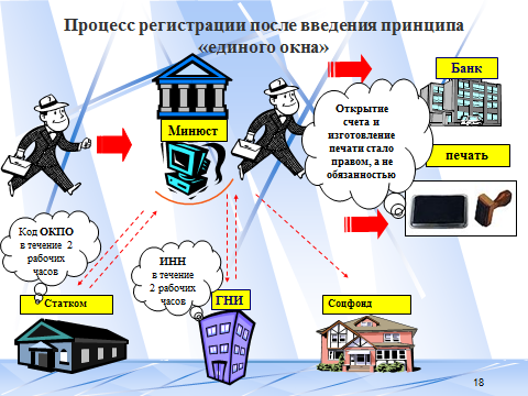 — В 2008 году в министерстве ввели принцип «единого окна» при регистрации юридических лиц, филиалов (представительств). Благодаря системе отпала необходимость обращаться в налоговые органы, Соцфонд и органы статистики для регистрации коммерческой компании. Учредитель автоматически получал свидетельство о регистрации с ИНН и кодом ОКПО (Общей классификации предприятий).