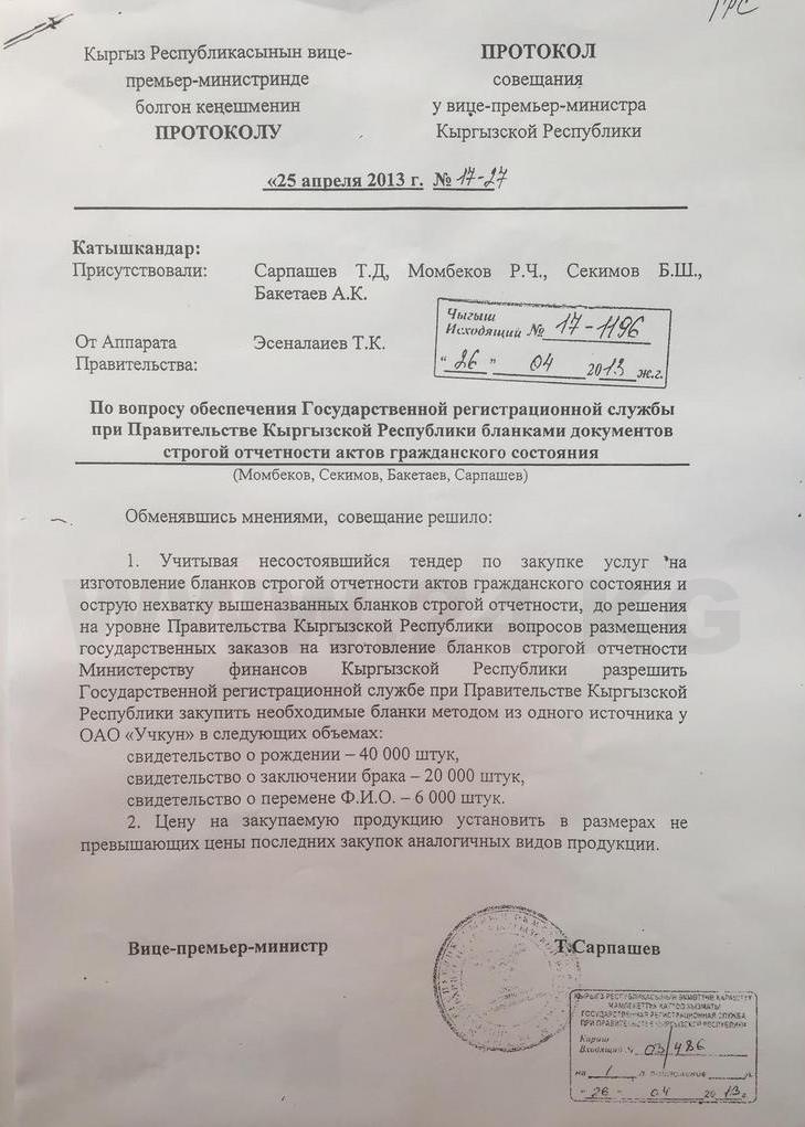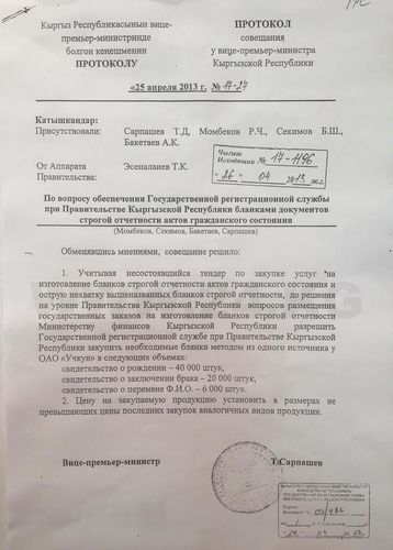 Источник ИА «24.kg» рассказывал, что на каждой встрече чиновники ГРС аргументировали требование «личным распоряжением Тайырбека Сарпашева» и «острой необходимостью получить бланки уже сегодня, а не по договору в течение 10–15 дней». Понимая, что побороть госмашину не удастся, победитель вынужден был согласиться на предложенные условия.