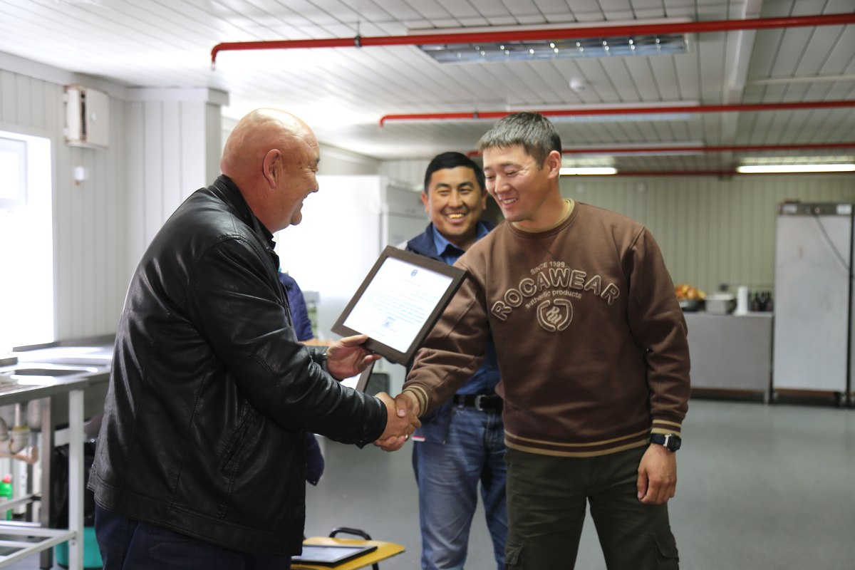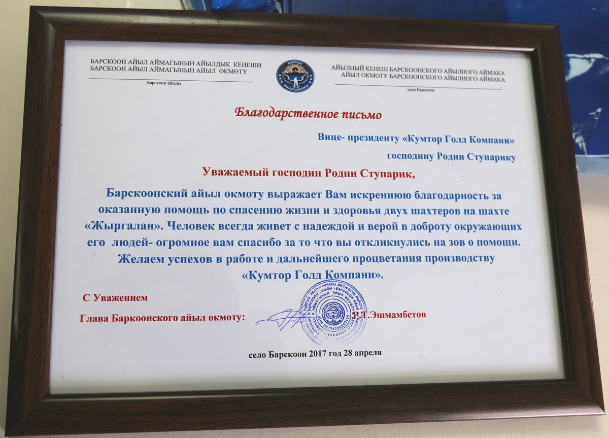 На днях Руслан Эшмамбетов приехал на рудник «Кумтор», чтобы вручить благодарственные письма всем специалистам, участвовавшим в операции по спасению шахтеров. Среди отмеченных и вице-президент Родни Ступарик, и руководители служб, и диспетчеры, обеспечившие быструю комплектацию бригады и доставку ее на место происшествия, и участники бригады — начальник службы водоотлива Бейше Токоев, член администрации рудника Аскар Мамырканов, инженер-электрик Найзабек Исманов, специалист по технике безопасности Марат Шабиев и инженер-механик Эльнур Гайнутдинов.